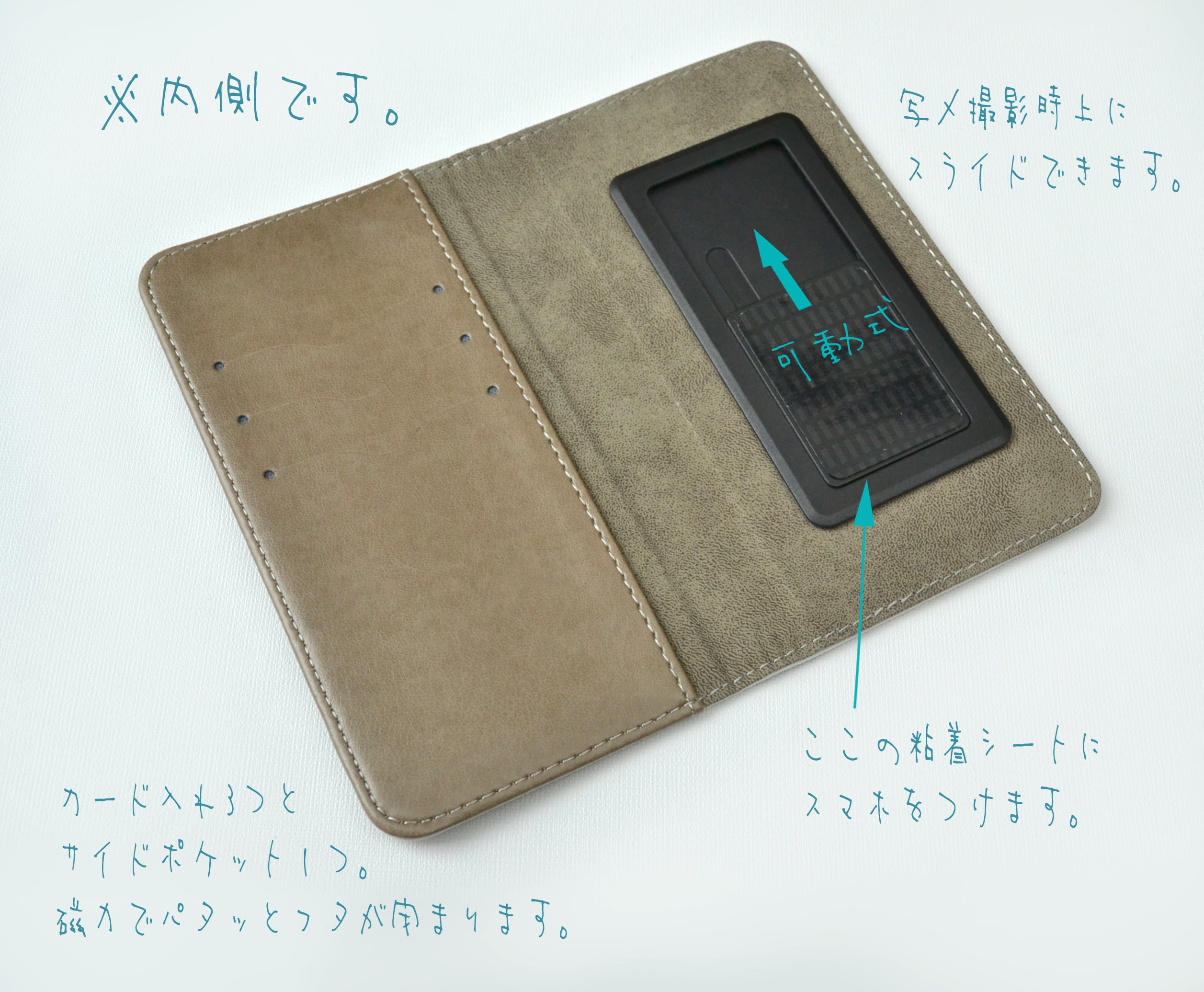 装着したまま撮影ができるスライド式の手帳型スマホケースです。微弱マグネットで程よくフタが閉じます。中面はカードポケット3つと、お札など収納できるポケット1つがあり、高級感あふれるシュリンクレザー風のPUレザーを使用しております。(画像をご参照ください)